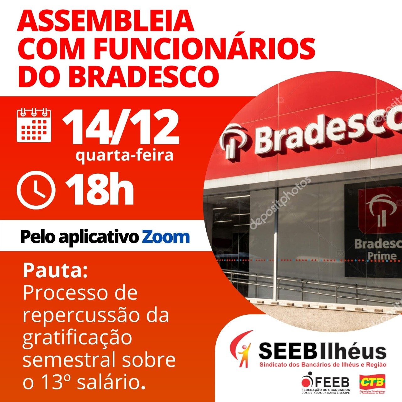 O Sindicato dos Bancários de Ilhéus e Região convoca os funcionários do Bradesco para a assembleia que se realizará dia 14/12/2022, às 18h, em primeira convocação, e às 18h15 min, em segunda convocação, de forma virtual, através do aplicativo Zoom para discussão e deliberação acerca da seguinte ordem do dia: