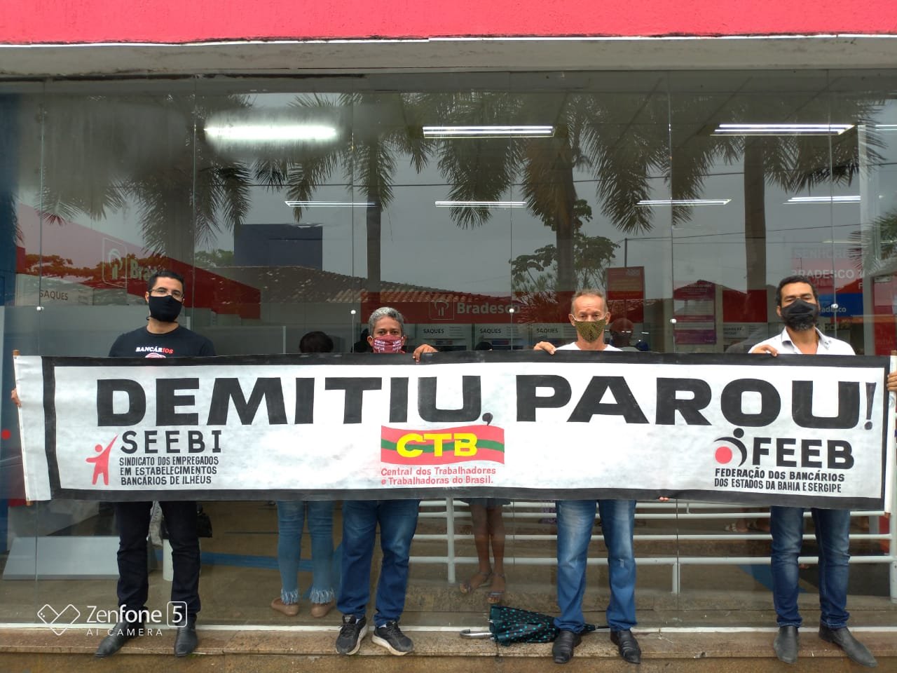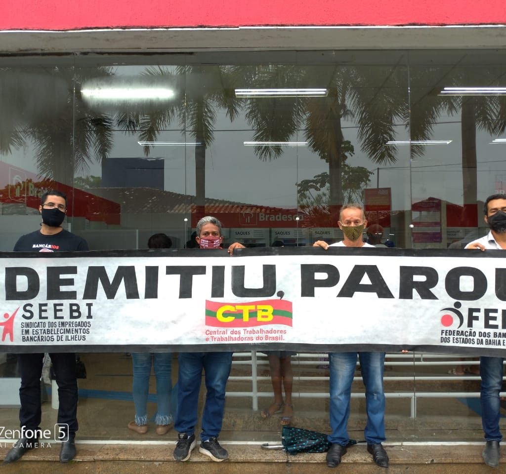 Como forma de protesto em defesa do emprego, o Sindicato dos Bancários de Ilhéus, realizou um ato, na manhã desta quinta-feira (29), em frente a agência do Bradesco 237, no Centro de Ilhéus. O manifesto faz parte do Dia Nacional de Luta contra as demissões e cobrou respeito da empresa que lucrou R$ 5,031 bilhões no terceiro trimestre e R$ 7,626 bilhões nos primeiros seis meses de 2020.
