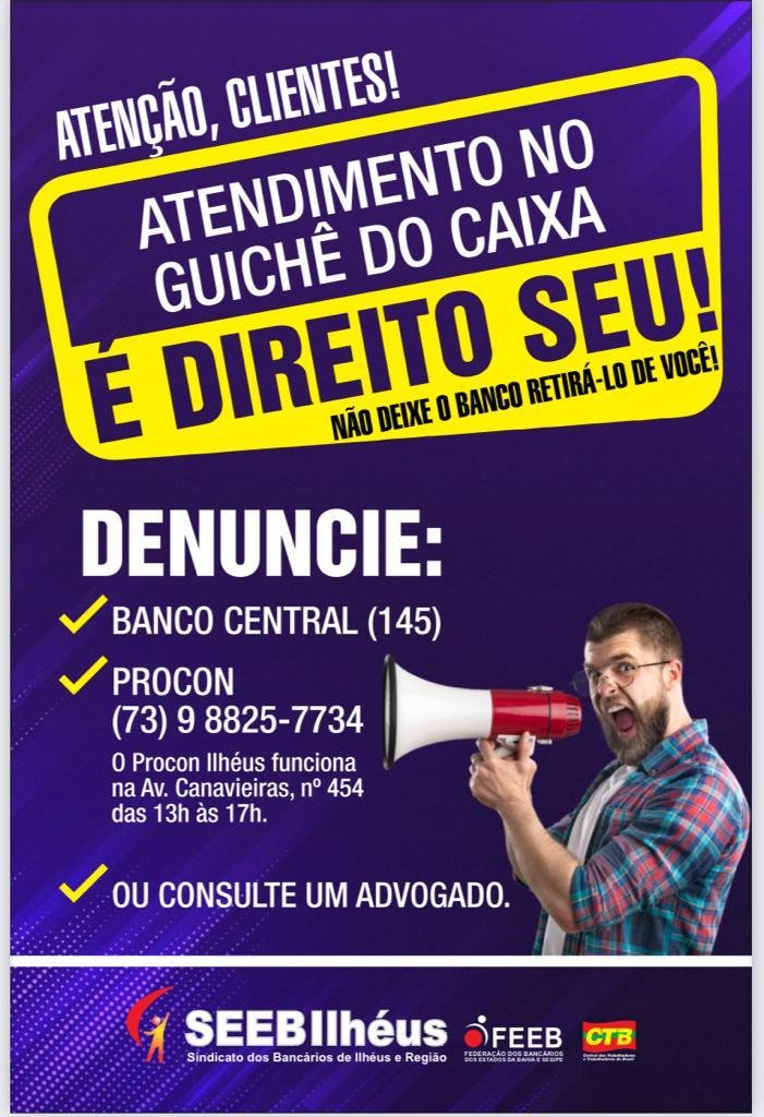 “Já havia um normativo desde 23 de março de 2022 informando isso e o banco não vinha cumprindo. Estava bloqueando os clientes na porta. Aí, o sindicato de Ilhéus começou com essa campanha informando os clientes que é direito deles o atendimento no guichê de caixa, incentivando a fazer denúncias no Banco Central, no PROCON, entrar na justiça e adotar outras providências”, complementou.