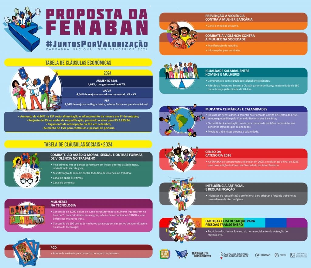 Além das cláusulas econômicas, a proposta incluem avanços também em várias cláusulas sociais, como combate ao assédio sexual e moral, igualdade salarial, censo da categoria, dentre outros. A CCT dos bancários tem 140 cláusulas.