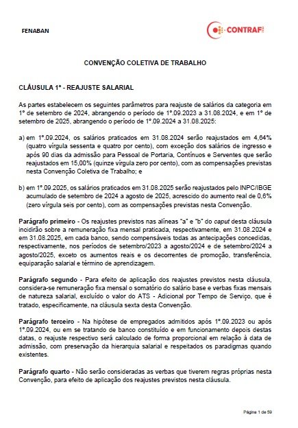 A última rodada de negociação durou mais de 30 horas, começando na sexta (30) e terminando no sábado (31), quando, finalmente, os bancos apresentaram um reajuste de 4,64% para os salários e todas as verbas. Com esse percentual, o ganho real previsto à categoria em 2024 será de 0,7%. Juntando 2024 e 2025, o ganho real será de pelo menos 1,31%, podendo ficar acima disso, a depender do INPC.