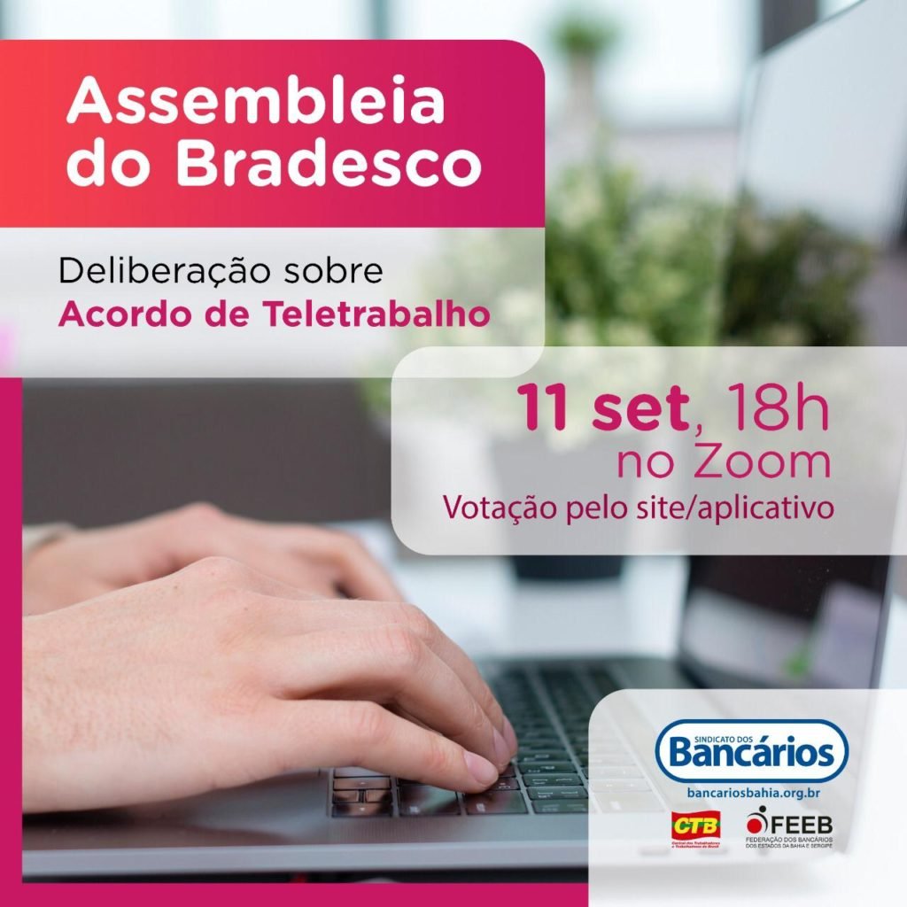 Sindicato dos Empregados em Estabelecimentos Bancários de Ilhéus, inscrito no CNPJ/MF sob o nº 14.172.555/0001-25, Registro sindical nº 217.586, por seu presidente abaixo assinado, convoca todos os trabalhadores bancários, sócios e não sócios, da base territorial deste sindicato, que prestam serviços para o conglomerado do Banco Bradesco para participarem da Assembleia Extraordinária Específica que se realizará de forma remota/virtual pelo aplicativo zoom no dia 11 de setembro de 2020 às 18h00min em primeira convocação e às 18h15min, em segunda convocação, na forma disposta no site www.seebilheus.com.br onde estarão disponíveis todas as informações necessárias para a deliberação acerca da seguinte pauta:Apreciação e deliberação sobre a proposta para celebração do Acordo Coletivo de Trabalho sobre Teletrabalho com o conglomerado do Banco Bradesco, com vigência de dois anos a partir da data da sua assinatura.