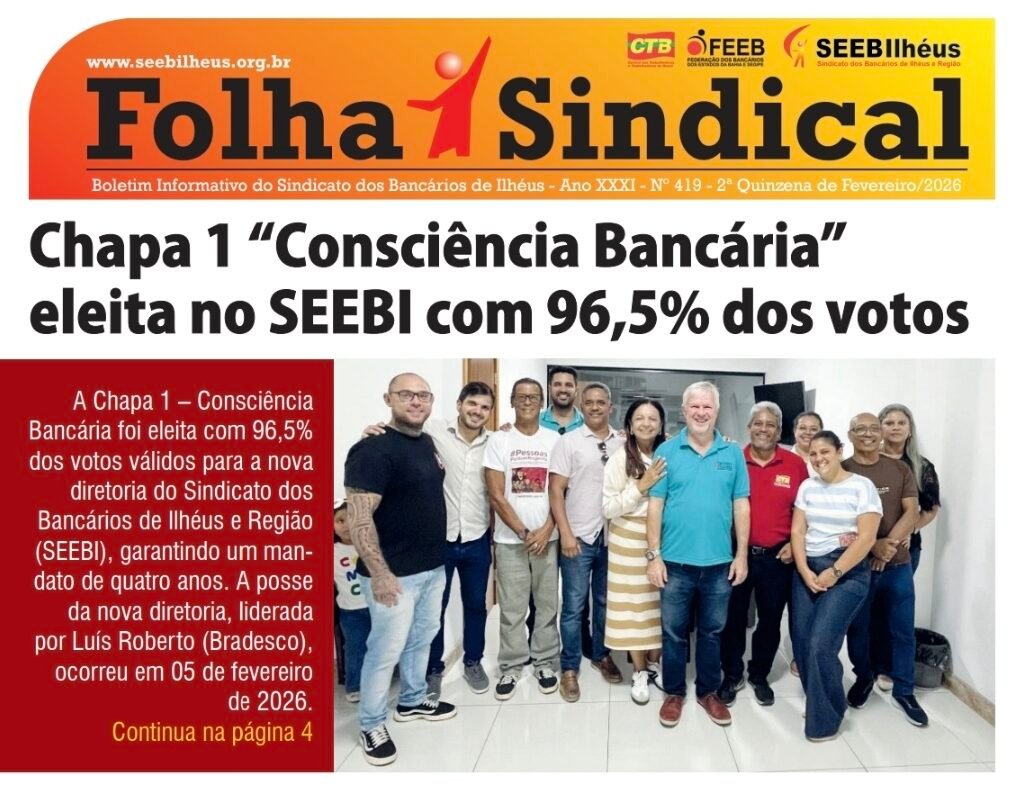Consciência Bancária foi eleita com 96,5% dos votos válidos para a nova diretoria do Sindicato dos Bancários de Ilhéus e Região (SEEBI), garantindo um man- dato de quatro anos. A posse da nova diretoria. liderada por Luís Roberto (Bradesco), ocorreu em 05 de fevereiro de 2026.