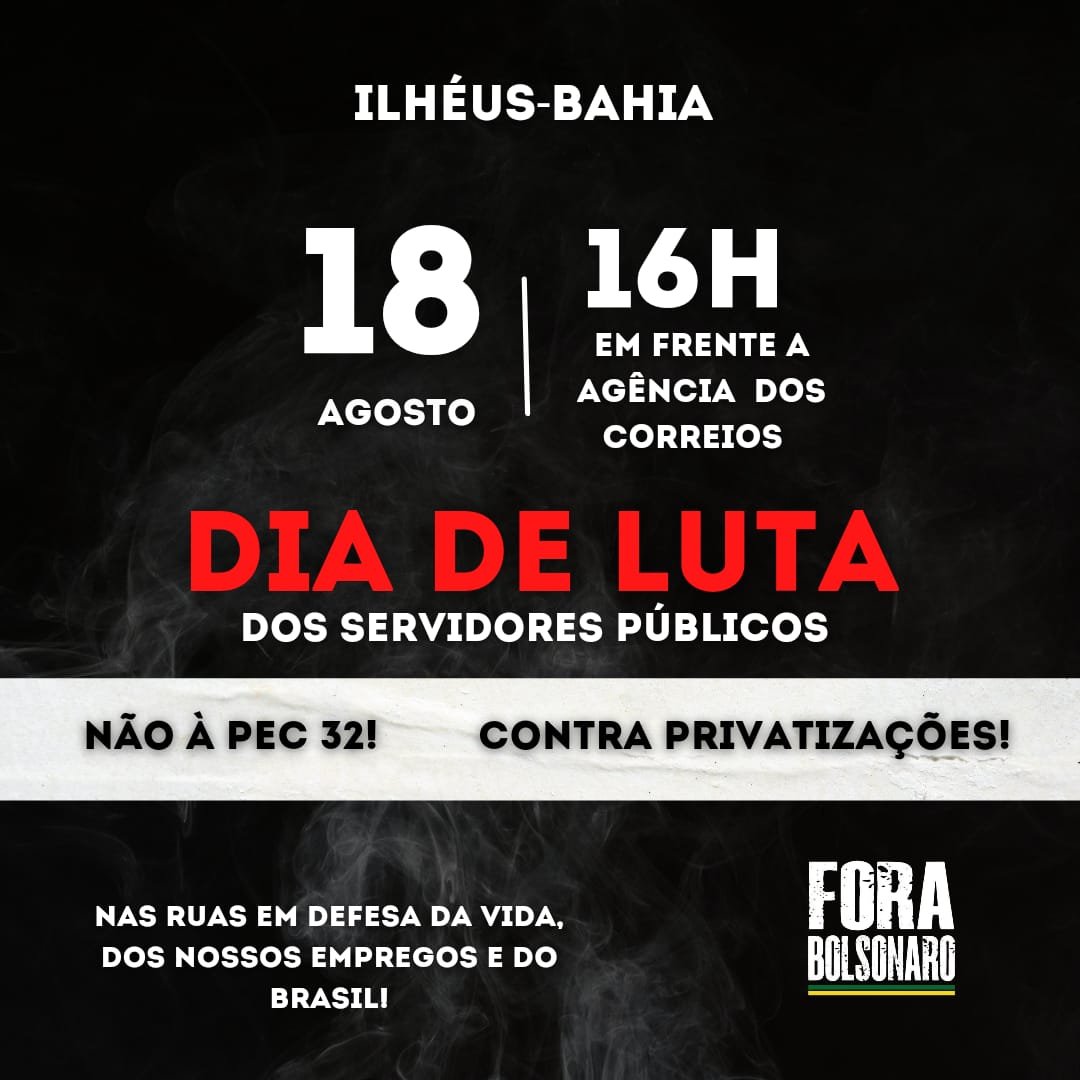 Diante da ofensiva do governo Bolsonaro com a PEC 32 – da reforma administrativa -, os trabalhadores preparam grandes manifestações em todo o país. O Dia Nacional de Luta será nesta quarta-feira (18/08) e os bancários da Bahia vão participar com protestos em todo o Estado. Em Ilhéus, a concentração será em frente a agência central dos Correios, no Calçadão da Marquês de Paranaguá, Centro da cidade, a partir das 16h.