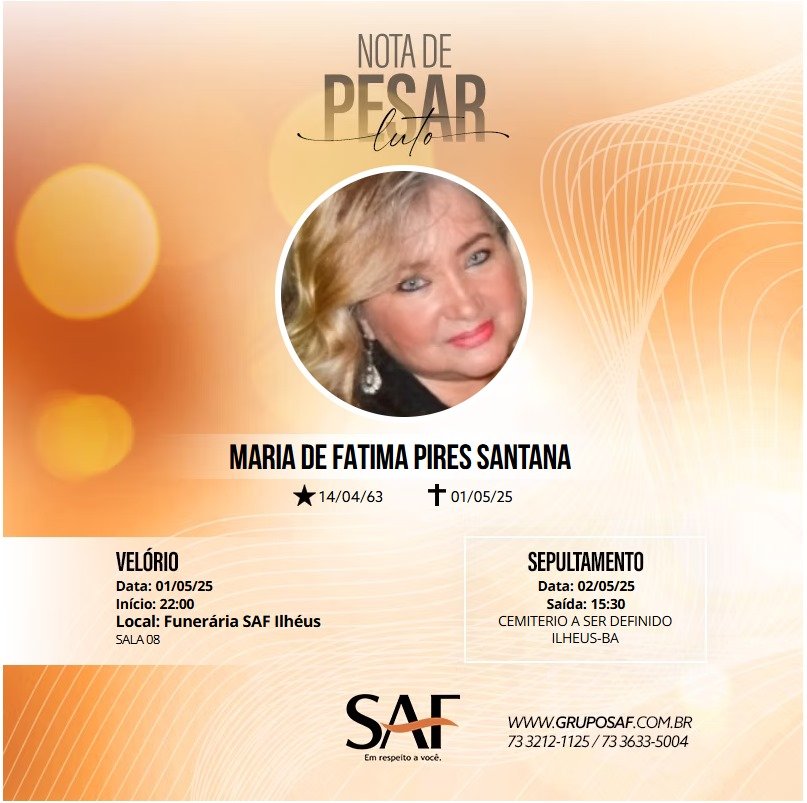Nossas sinceras condolências à família e amigos de Maria de Fátima Pires Santana. Que encontrem força e consolo nos momentos difíceis que se seguem.