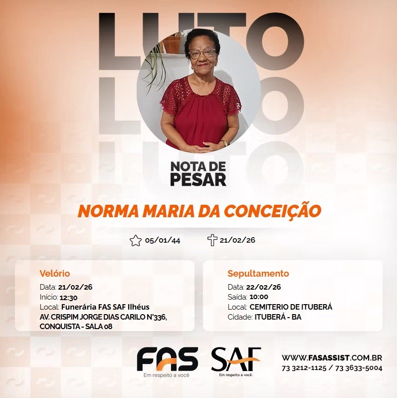 - Velório: Teve início às 12:30h deste sábado, dia 21/02/26, na Funerária FAS SAF Ilhéus (Av. Crispim Jorge Dias Carilo, nº 336, Conquista – Sala 08).