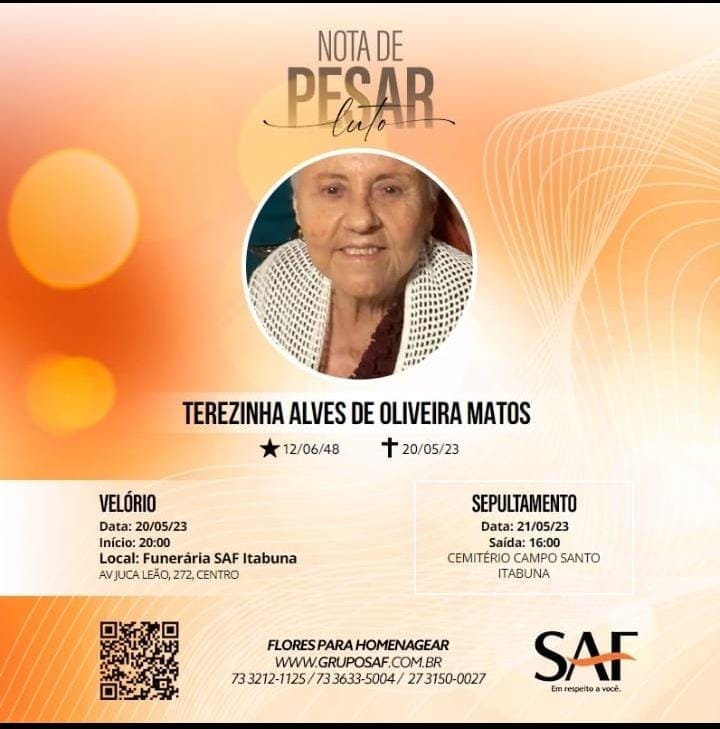 Neste momento de dor, expressamos pesar pelo falecimento de Terezinha Alves de Oliveira Matos.