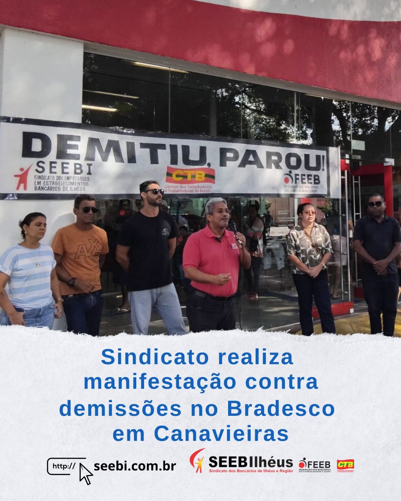 Na manhã desta terça-feira, 06 de maio, o Sindicato dos Bancários de Ilhéus promoveu uma manifestação em frente à agência do Bradesco, no município de Canavieiras, em protesto contra as recentes demissões promovidas pelo banco. A ação contou com o apoio da Central dos Trabalhadores e Trabalhadoras do Brasil (CTB), da Federação dos Bancários da Bahia e Sergipe, da Unegro e do Sindicacau.